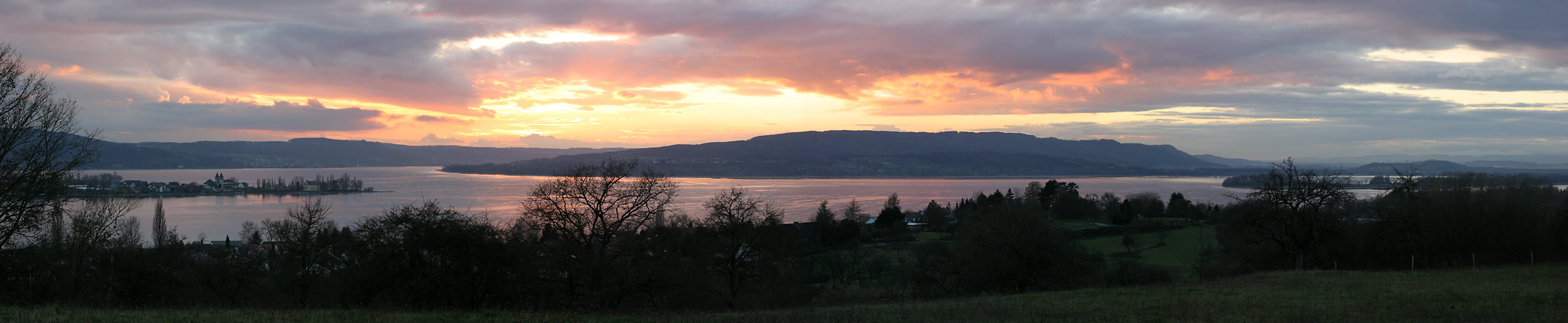 Die gerade untergegangene Sonne zaubert wunderschöne Farben an den Abendhimmel. Das Wasser des Bodensees vor der Höri und der Insel Reichenau schimmert in pastellfarbenen Rot/Lilatönen: