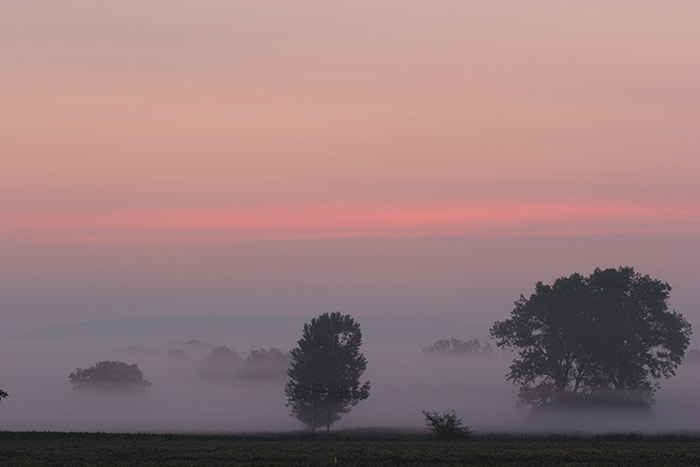Selbst warme Sommernächte verursachen im Aachried am Radolfzeller See oft starke Nebelbildung. Im Juni ist die Morgendämmerung um 5 Uhr bereits weit fortgeschritten, so dass man einen roten Morgenhimmel vorfindet.