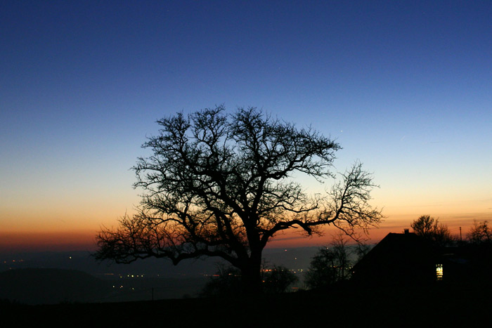 Knapp eine Woche später (15. März, Merkur ist links neben dem Baum). Der Schnee ist geschmolzen. Man sieht links im Bild die markante Silhouette des Hohenstoffeln.