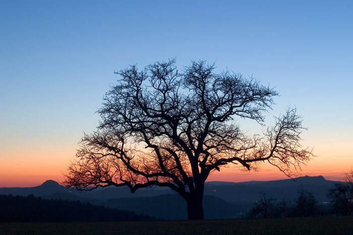 Kurz nach Sonnenuntergang. Man sieht die beiden Hegauberge Hohentwiel (links) und Hohenstoffeln (rechts):