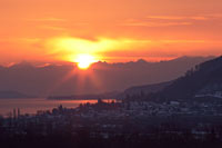 Sonnenaufgang über Bodman mit der Alpenkette des Bregenzerwaldgebirges
